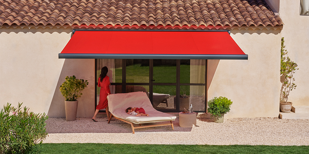 La campagne se poursuit et nous dévoile l’acteur à l’origine de cette ombre rafraichissante et protectrice. La toile de store DICKSON, d’un rouge flamboyant, descend délicatement pour révéler tout son potentiel, puis le mouvement de la toile de store vient masquer la lumière du soleil. Le film s’achève sur un plan d’ensemble en plongé sur la terrasse de la maison, avec l’enfant en sommeil et sa mère assise à ses côtés, tous deux protégés du soleil par la toile de store.