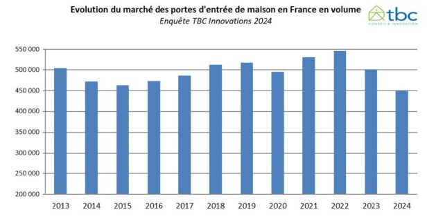La crise profonde qui secoue la construction de la maison neuve en France continue de peser lourdement sur les marchés des menuiseries, et tout particulièrement sur celui des portes d’entrée. Par ailleurs, la frilosité persistante des ménages en matière de rénovation, dans un contexte économique et politique incertain, amplifie la tendance baissière du marché des portes d’entrée. La contraction du marché s’est maintenue en 2024, pour passer en dessous de la barre symbolique des 500 000 unités, avec seulement 450 000 portes posées en 2024.