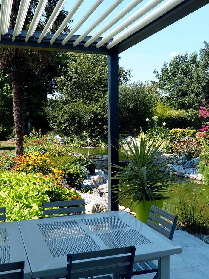 Les configurations et esthétiques de l’Espace de vie MULTI-SAISONS Suneal sont multiples. Les lames motorisées s’intègrent parallèlement ou perpendiculairement au bâti et s’orientent jusqu’à 130°. La structure est pilotable à l’aide d’une télécommande fournie par Technal (et peut être raccordé à un système de gestion centralisée).