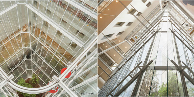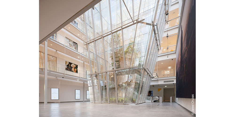Dominant la “piazza”, une pyramide de verre inversée d’une emprise au sol d’environ 300 m² et avec une base de seulement 45 m², plonge dès l’entrée le visiteur dans cette élégante structure de verre et d’acier déployée sur 29 m de large, créant une ouverture libre de 154 m² d’où se précipite la lumière naturelle inondant les cinq étages du bâtiment. Les 1 200 m² et 150 tonnes de la façade intérieure ainsi suspendue, sont maintenus et stabilisés par des systèmes de profilés et traverses encadrant le vitrage. C’est au façadier Josef Gartner que l’on doit la construction de la structure en acier gris clair.